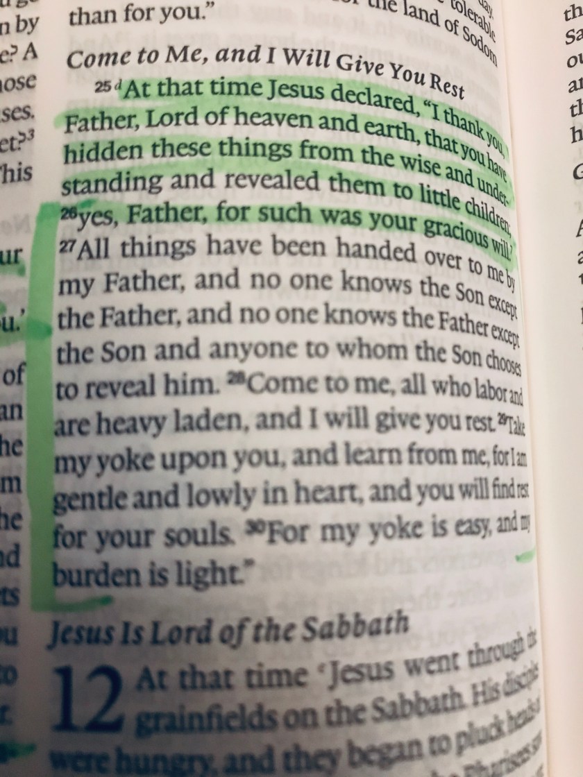 I could approach him smothered in sin and garbage like Magic Shell ice cream topping and he would just reach out to me and say, “Come.” Matthew 11:28-30 told me again what I needed to know.